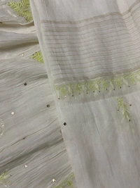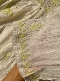 Delicately embroidered with colourful Chikankari threads and adorned with handmade Mukaish karigari, this piece exudes a graceful shimmer that catches the light with every movement.