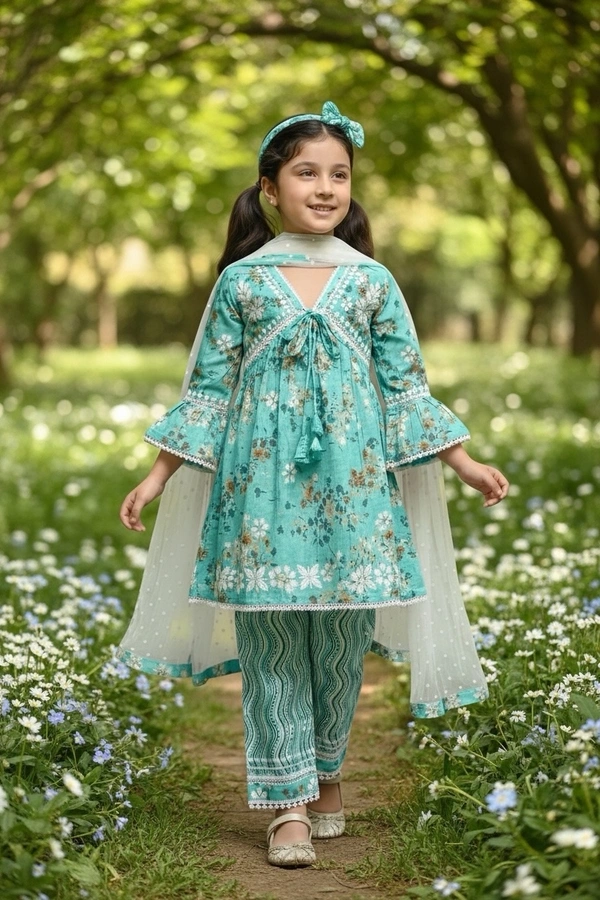 Afshan Tiered Mul Print Kids Chikankari Set -Firozi