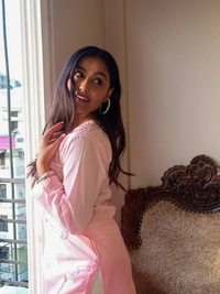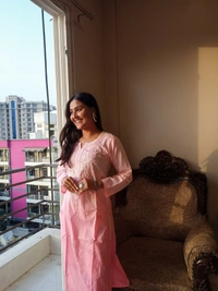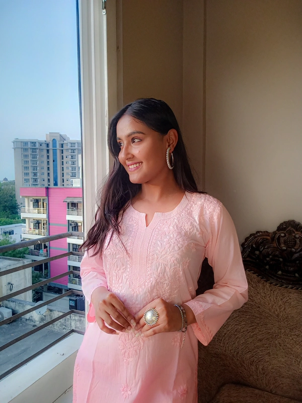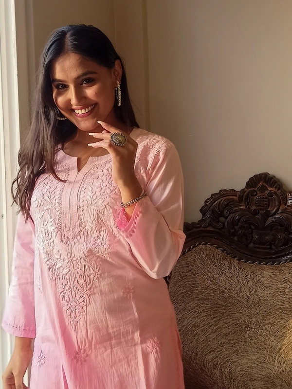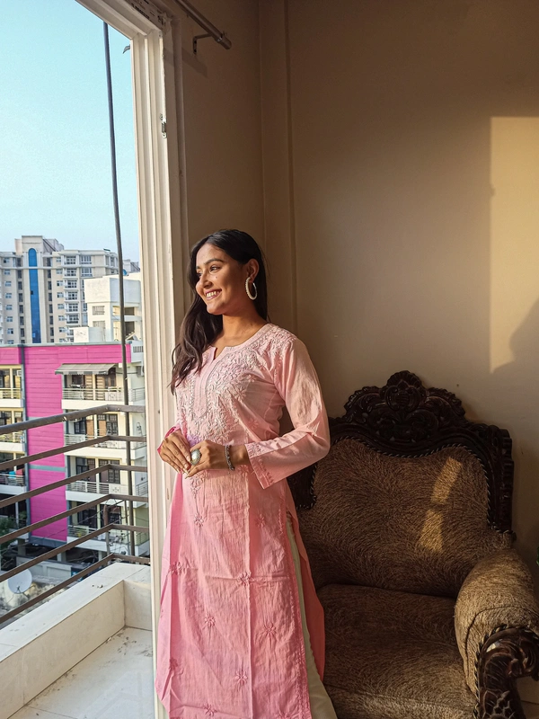 Baby Pink Neck Work Chikankari Straight Long Kurti