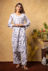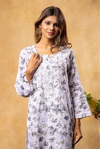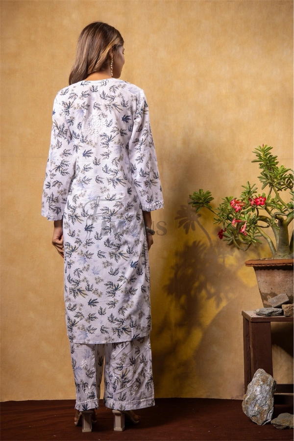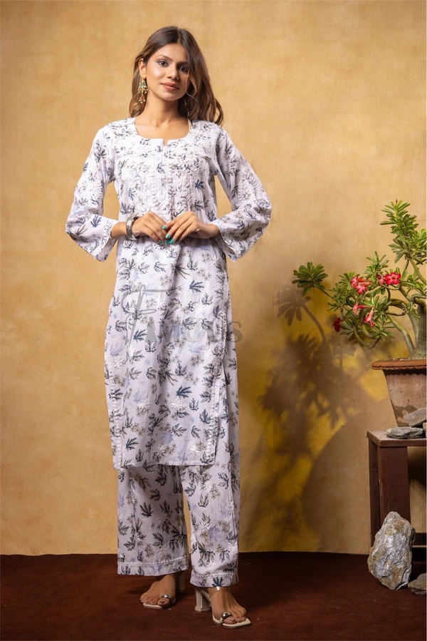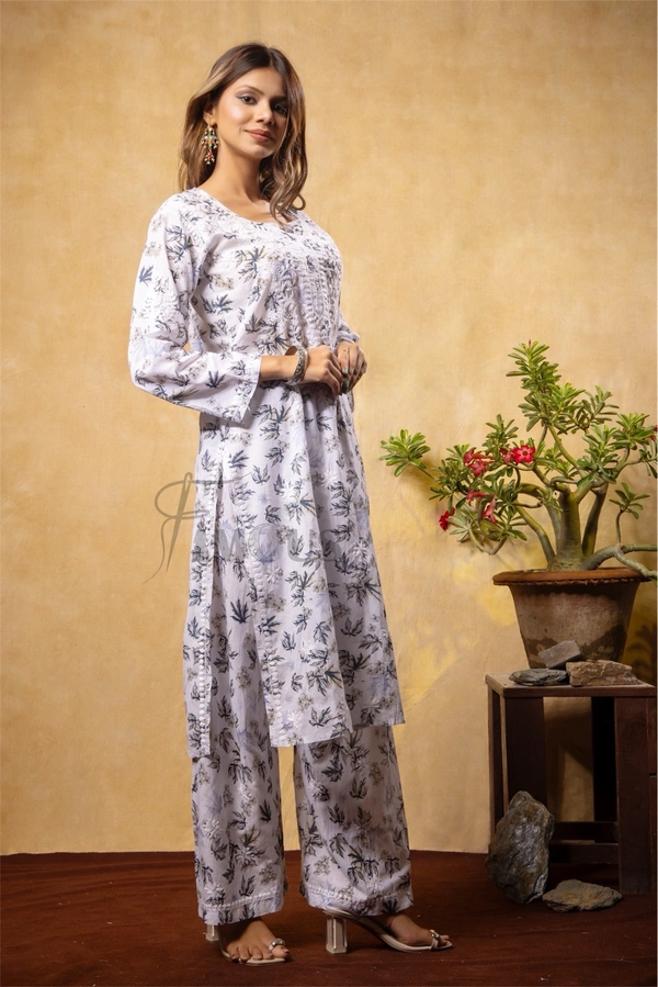 Beautiful Chikankari Mulmul Print Kurti Plazo Set-Grey