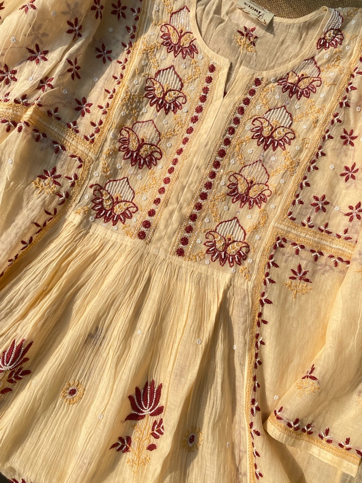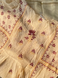 Step into sophistication and timeless beauty with our Beige Chikankari and Zardozi Semi-Stitched Gown. Crafted from luxurious Soft Mul Chanderi fabric, this exquisite gown is a harmonious blend of traditional artistry and modern design. The intricate Chikankari handwork, adorned with shimmering pearls, katdana, and sequins, showcases unparalleled craftsmanship, making this gown a true masterpiece.
