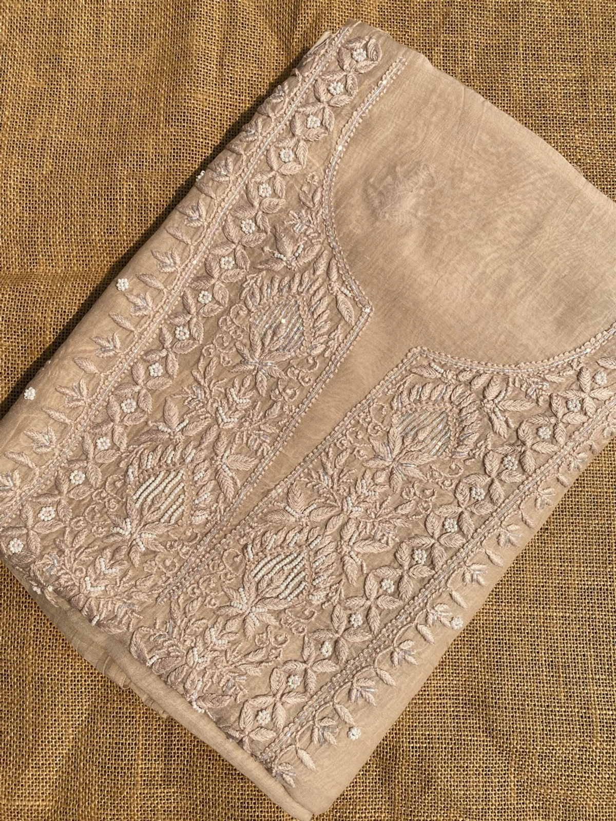 Elevate your style with this exquisite beige Chikankari dress in pure Mul Chanderi fabric. Featuring intricate Chikankari, adorned with pearl beads and sequins work. Paired with thick plain cotton bottom fabric for a perfect blend of elegance and comfort.