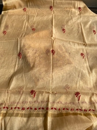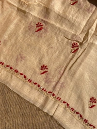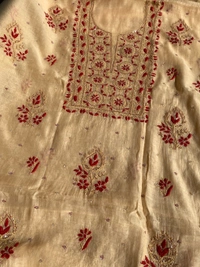 Elevate your style with this exquisite beige Chikankari dress in pure Mul Chanderi fabric. Featuring intricate maroon thread and beige matching Chikankari, adorned with pearl beads and sequins work. Paired with thick plain cotton bottom fabric for a perfect blend of elegance and comfort.