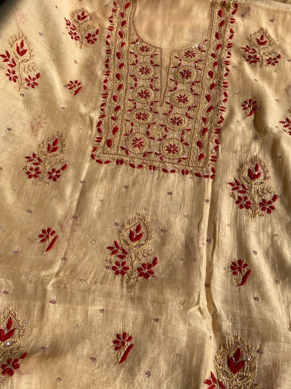 Beige Pure Mul Chanderi Chikankari Unstitched Dress