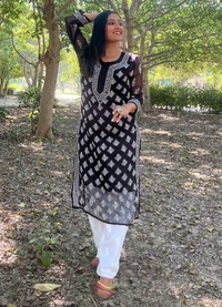 - Embroidery: Intricate Chikankari embroidery done all over in front and motifs at the back