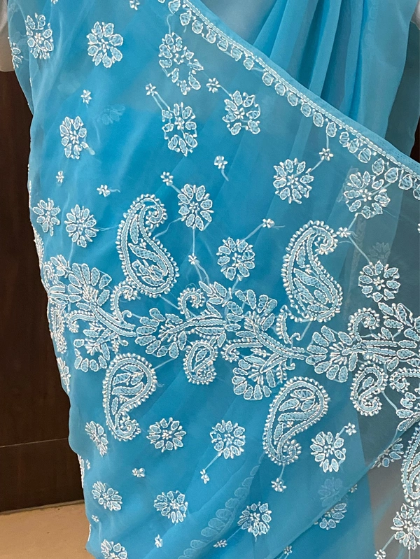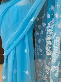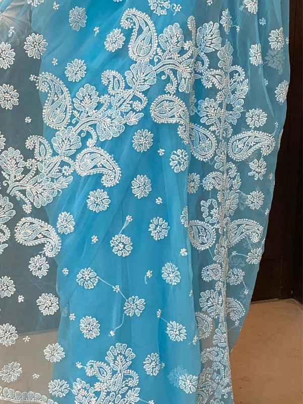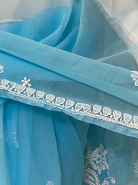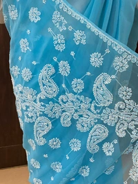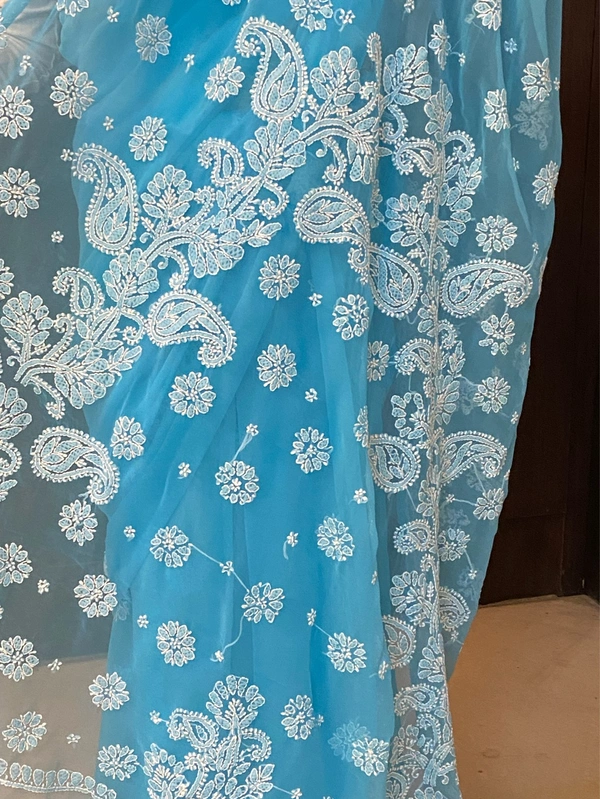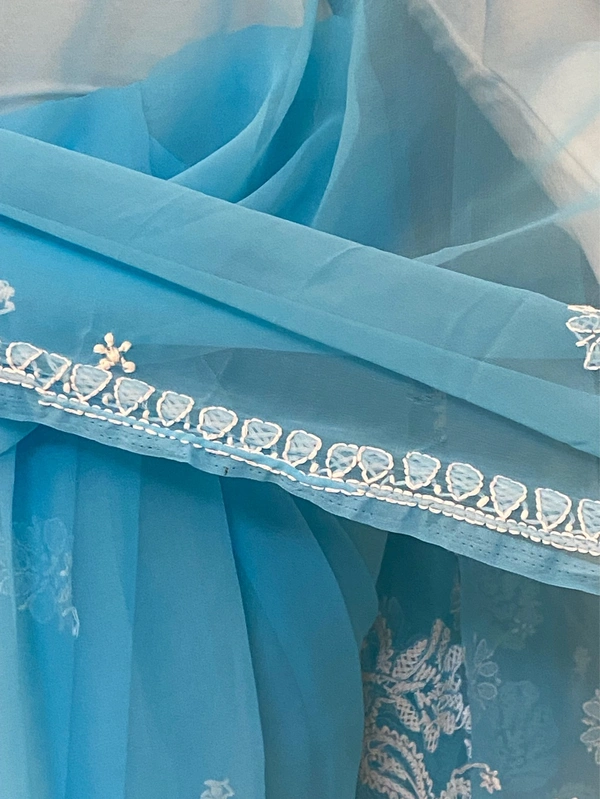 Blue Chikankari White Embroidered Saree