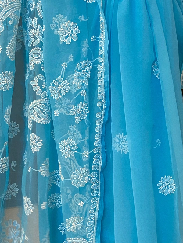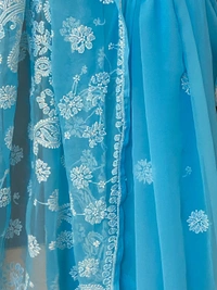 Drape yourself in elegance with this beautifully handcrafted blue Chikankari saree, designed to reflect grace and tradition. Crafted from premium faux georgette fabric, this saree offers a soft, flowy texture that ensures both comfort and a flattering silhouette.