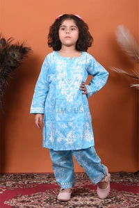 Blue Mulmul Print Chikankari Kids Dress