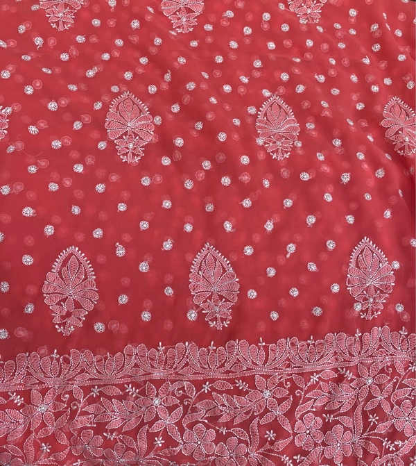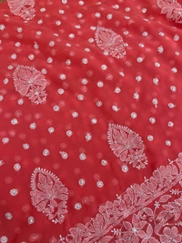 Make a bold yet graceful statement with this exquisite red Chikankari saree, beautifully crafted to reflect timeless Lucknowi artistry. Designed on soft and flowy faux georgette fabric, this saree offers both elegance and comfort, making it perfect for special occasions.