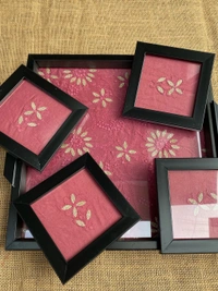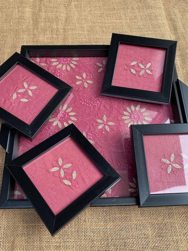 Elegant Chikankari Tray with Coasters - Handcrafted pvc wooden finish tray featuring intricate Chikankari and Gotapatti embroidered fabric, topped with glass. Available in Blue, Teal, and Red with gold floral designs. Perfect gift for weddings, birthdays, or special occasions. Made with love, for you.