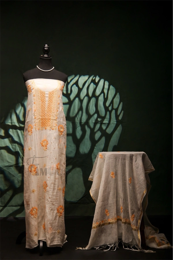 - Exquisite Embroidery: Adorned with finely detailed chikankari work, featuring a harmonious blend of light and dark orange thread embroidery against an off-white base.