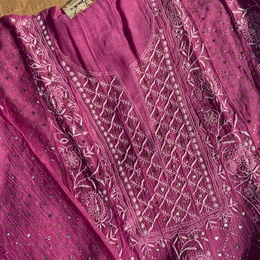 Elevate your ethnic wardrobe with the Dark Pink Chikankari & Mukaish Anarkali and Dupatta Set, a masterpiece crafted to perfection by Famous Creations. Made from soft Mul Chanderi fabric, this semi-stitched Anarkali set is designed to exude elegance and charm. The intricate Chikankari embroidery combined with delicate Mukaish handwork makes this outfit a stunning choice for weddings, festive celebrations, and special occasions.