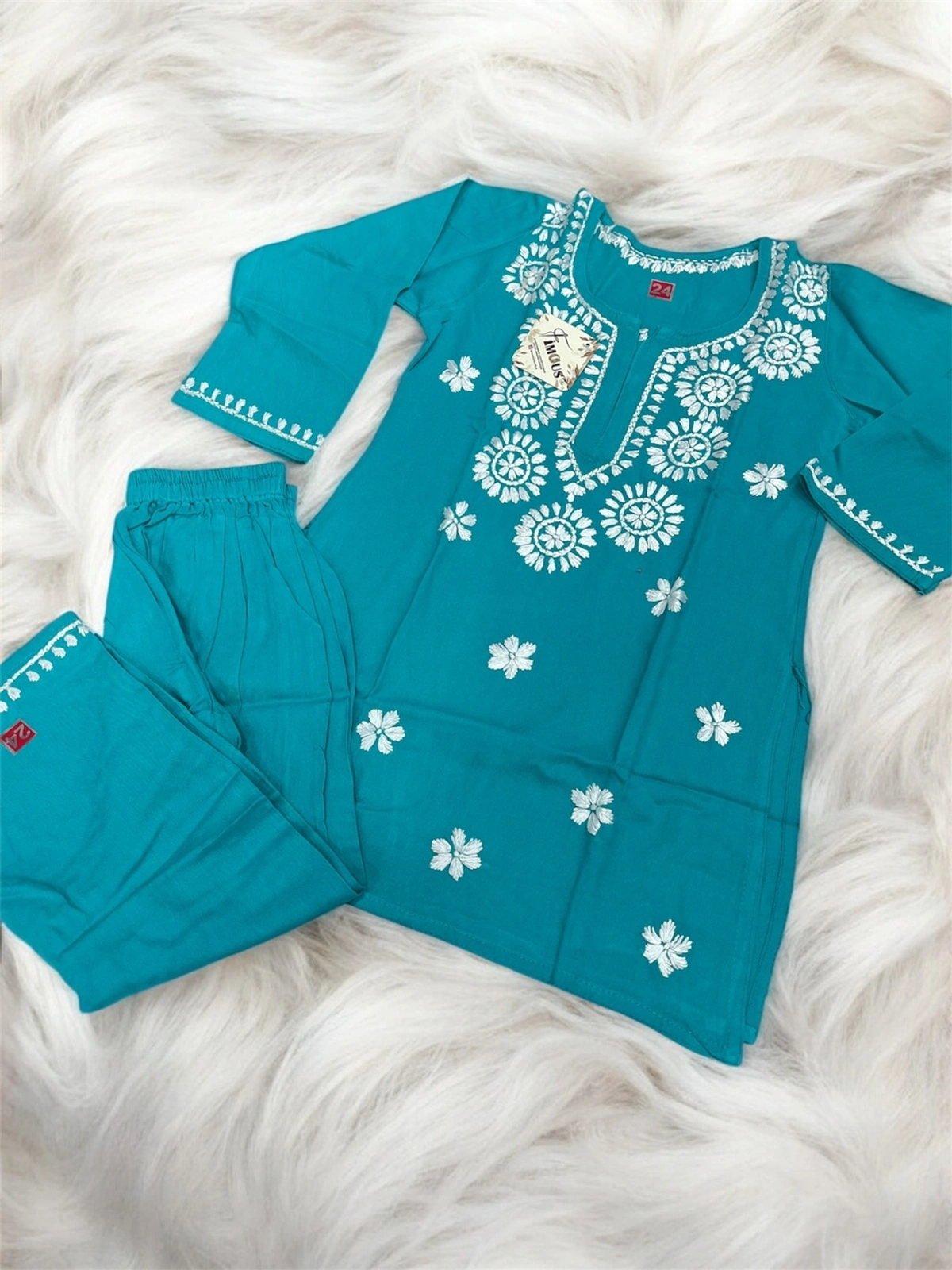 Firozi Blue Reyon Chikankari Kids Dress