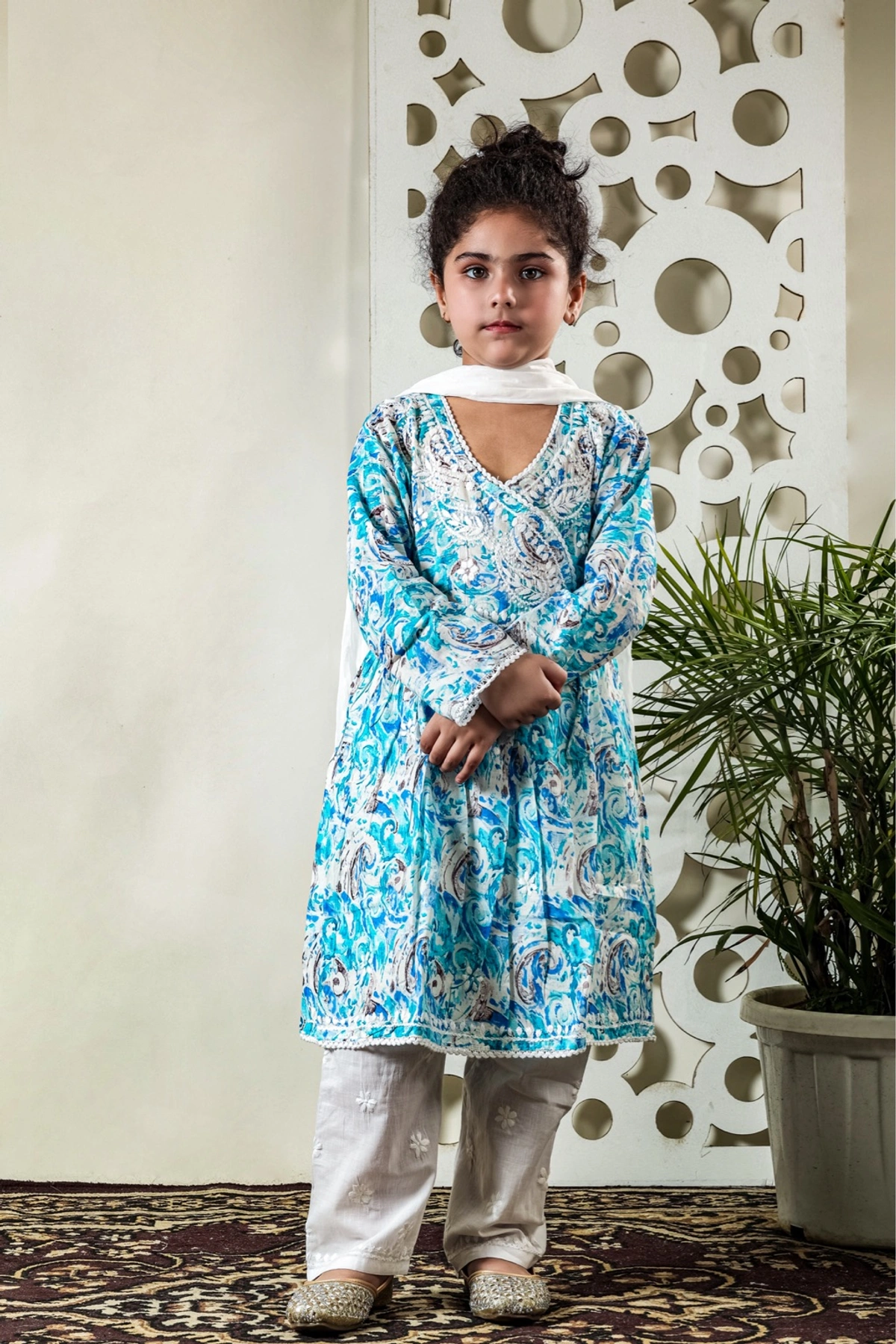 Fiza Angarkha Mul Print Kids Chikankari Set - Blue