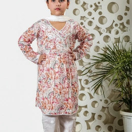 Fiza Angarkha Mul Print Kids Chikankari Set - Peach