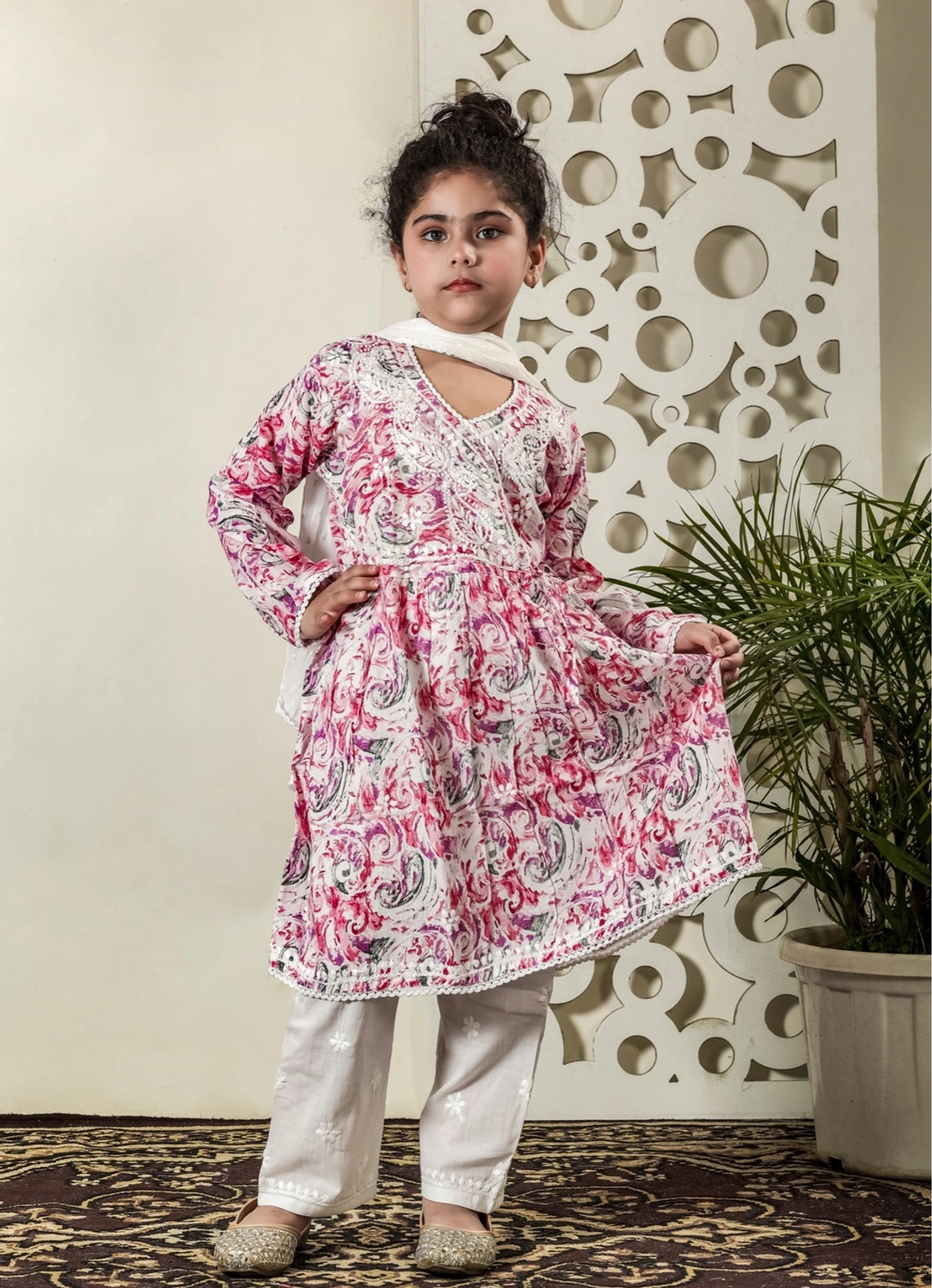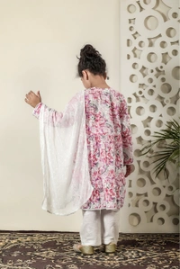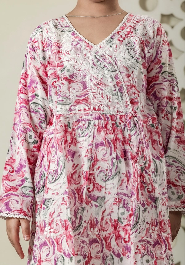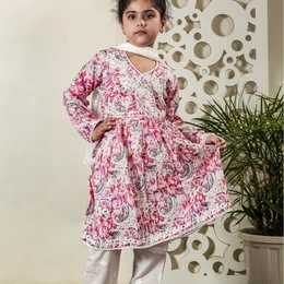 Fiza Angarkha Mul Print Kids Chikankari Set -Pink