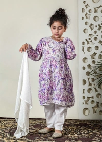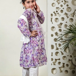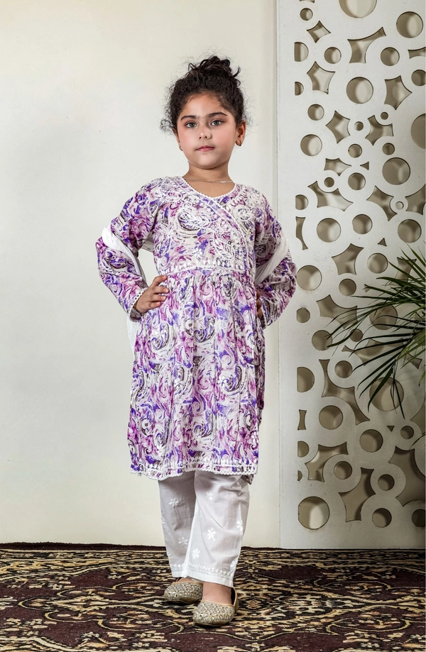 Fiza Angarkha Mul Print Kids Chikankari Set - Purple