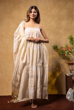 Experience the perfect blend of tradition and elegance with our Tussar Chikankari and Mukaish Semi-Stitched Gown. Crafted from luxurious Tissue Silk fabric in a stunning golden hue, this gown is a masterpiece that exudes sophistication and timeless charm. Intricate Chikankari handwork, adorned with mukaish and kamdani embellishments, showcases the impeccable skills of master artisans, making this gown a true work of art. Whether you're attending a wedding, festive celebration, or a formal event, this gown ensures you’re the center of attention.
