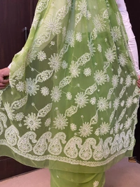 The saree features beautifully handcrafted Chikankari embroidery, highlighting a finely detailed pallu and delicately designed borders that reflect the richness of authentic Lucknowi artistry. Its soothing green tone adds a fresh and sophisticated appeal, making it suitable for festive occasions, casual gatherings, or elegant evening wear.