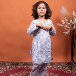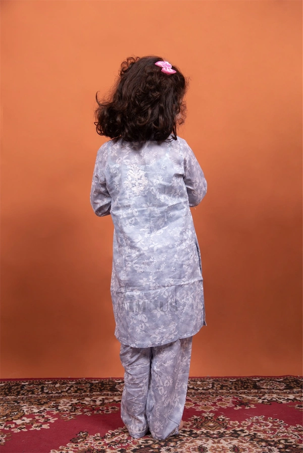 Grey Mulmul Print Chikankari Kids Dress