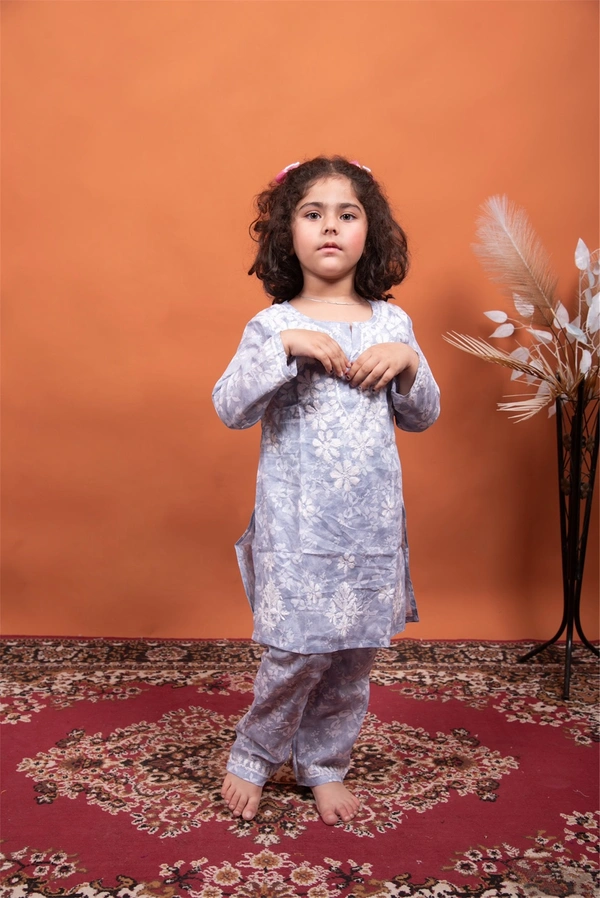 Grey Mulmul Print Chikankari Kids Dress