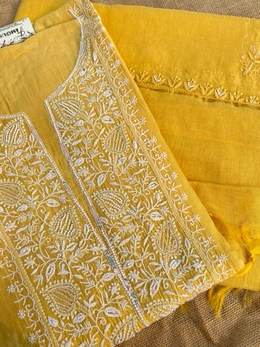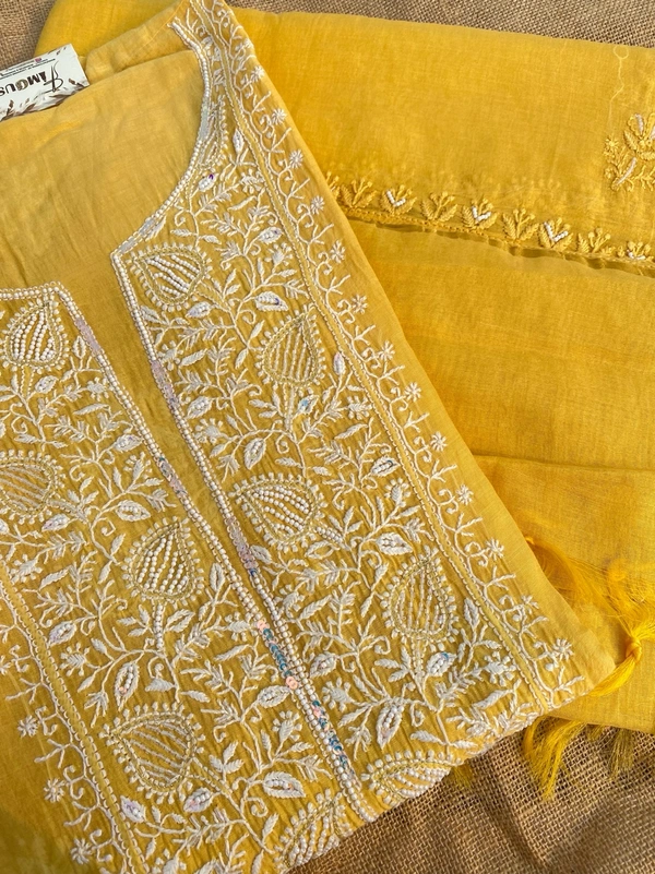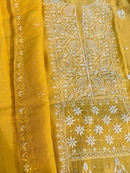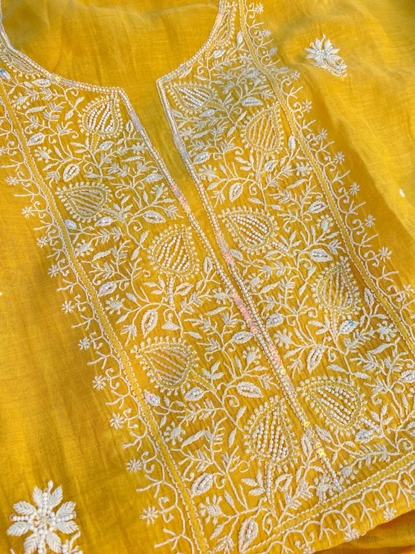 Add a pop of sunshine to your festive wardrobe with our stunning mustard yellow Chikankari semi-stitched kurta dupatta set, crafted on luxurious pure mul chanderi fabric. This exquisite ensemble features fine Chikankari work, intricately adorned with pearls, beads, and sequins.