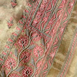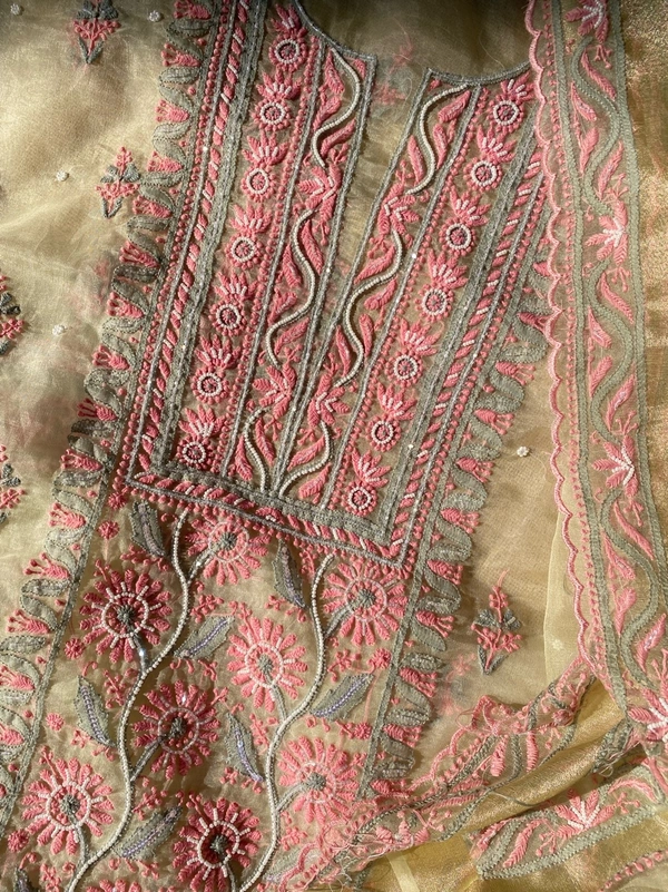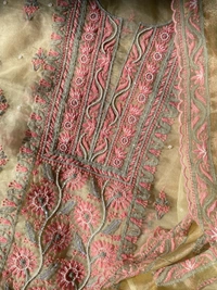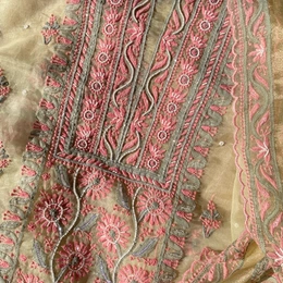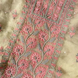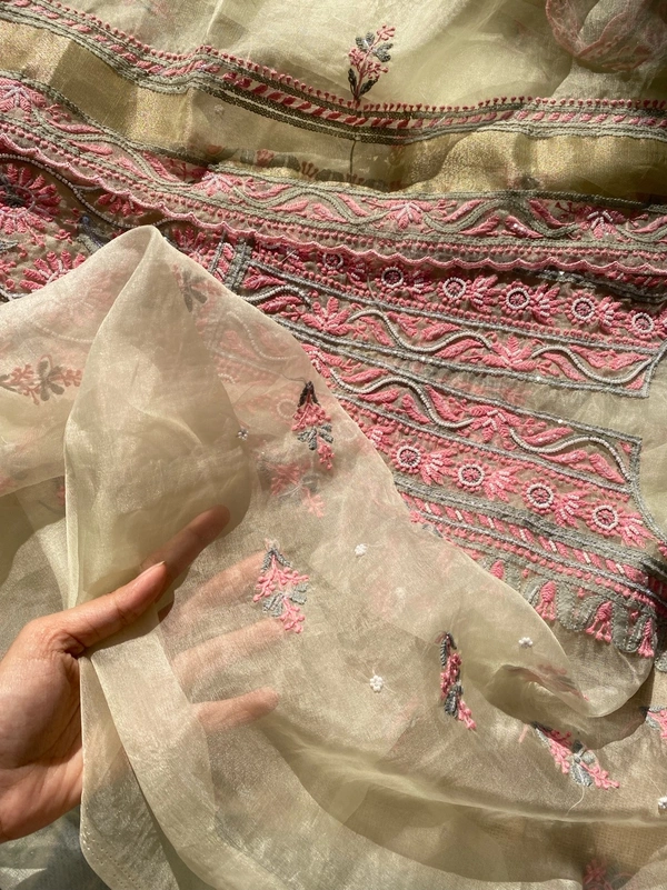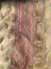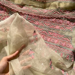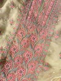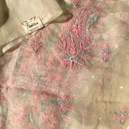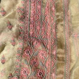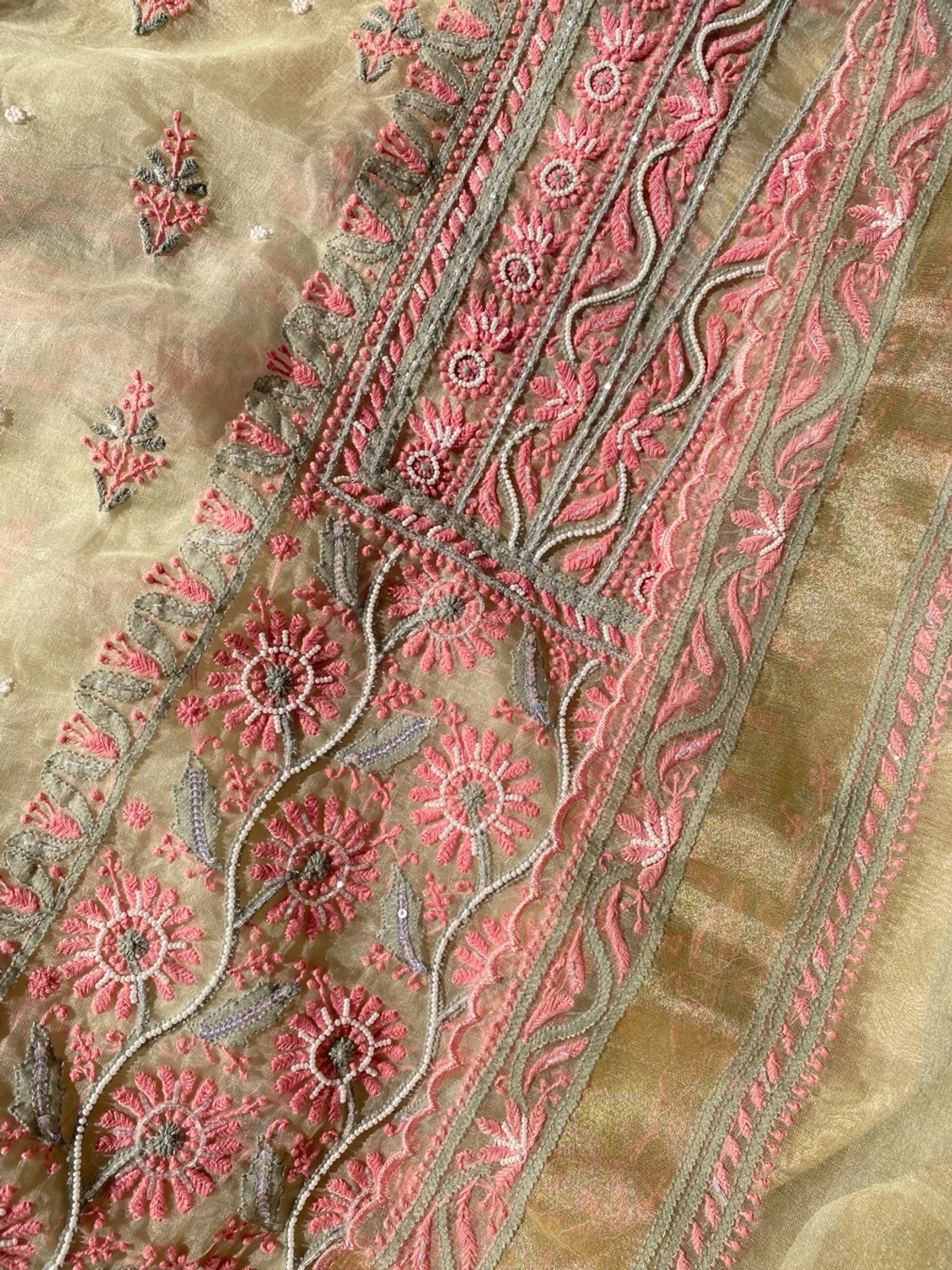 Crafted in premium Organza fabric, this stunning ensemble features fine Chikankari dual-color thread embroidery, beautifully enhanced with pearl, beads, and sequins work. The dupatta boasts a gorgeous golden zari border, adding a touch of luxury. The kurta features a beautiful panel design with motifs all over, showcasing the artistry of hand embroidery.