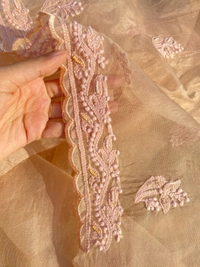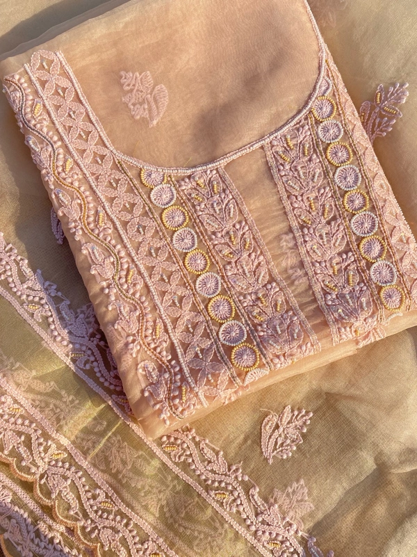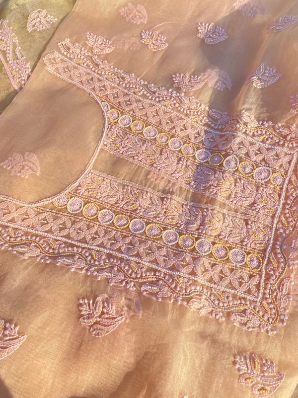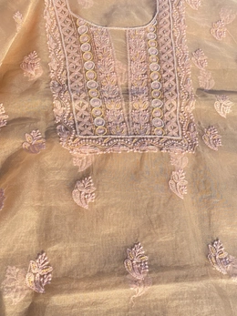 Elevate your wedding and special occasion wardrobe with our exquisite light peach Chikankari unstitched kurta dupatta set. This stunning ensemble features fine Chikankari work, intricately adorned with pearls, beads, and sequins.
