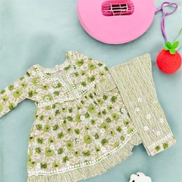 Adorn your little one in style with our exquisite Kids' Co-ord Sets, crafted in soft, breathable mulmul cotton. This delightful set features a beautiful mehndi green color with intricate fine Chikankari embroidery, adding a touch of elegance to your child's wardrobe.