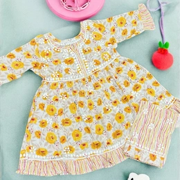 Adorn your little one in style with our exquisite Kids' Co-ord Sets, crafted in soft, breathable mulmul cotton. This delightful set features a beautiful mustard yellow color with intricate fine Chikankari embroidery, adding a touch of elegance to your child's wardrobe.
