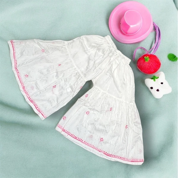 Adorn your little one in traditional elegance with our exquisite Chikankari kurti gharara set. Crafted from luxurious muslin silk, the kurti features intricate Chikankari embroidery on a pristine white fabric, highlighted with vibrant colored threads.