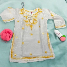 Adorn your little one in traditional elegance with our exquisite Chikankari kurti gharara set. Crafted from luxurious muslin silk, the kurti features intricate Chikankari embroidery on a pristine white fabric, highlighted with vibrant colored threads.