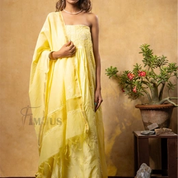 Step into the world of timeless elegance with our Yellow Elegant Chikankari Semi-Stitched Gown, designed to make you the center of attention at any special occasion. Crafted from luxurious Chanderi silk fabric, this masterpiece combines traditional artistry with modern sophistication. The soft and radiant lemon yellow hue exudes grace, while the intricate Chikankari embroidery adorned with pearls, katdana, and sequins showcases unparalleled craftsmanship.
