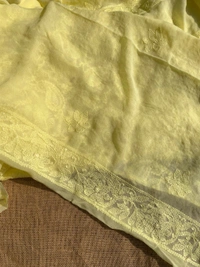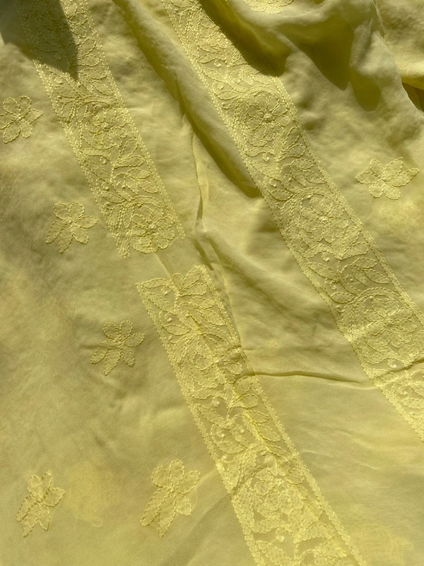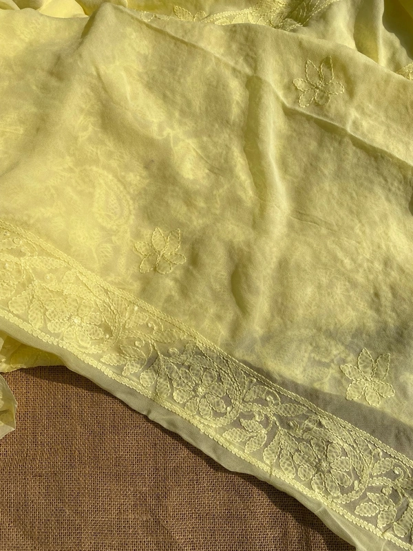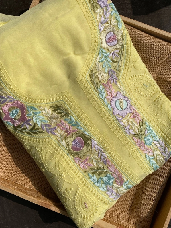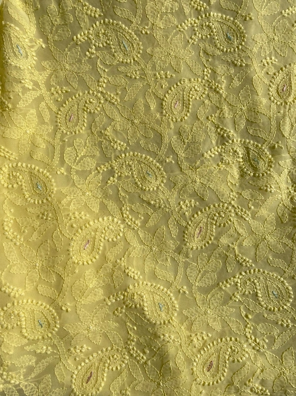 Lemon Yellow Chikankari Unstitched Dress in premium Viscose Georgette. Features all over handmade Chikankari jaalwork with Pari Gara multi-color embroidery. Includes unstitched kurta, dupatta with Chikankari border and butis, and plain shantoon bottom fabric. Crafted by artisans of Lucknow.