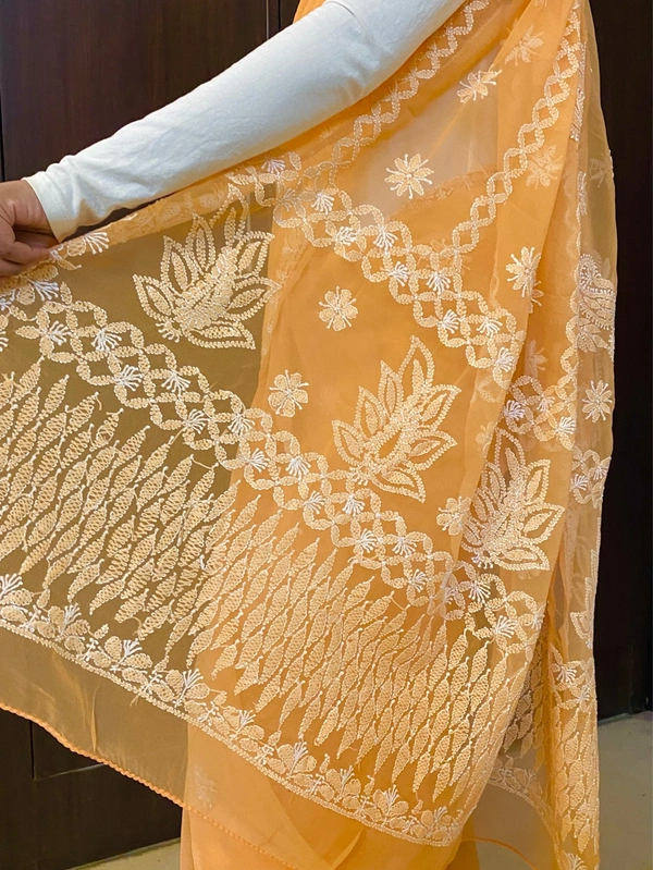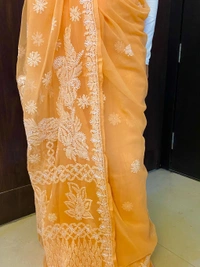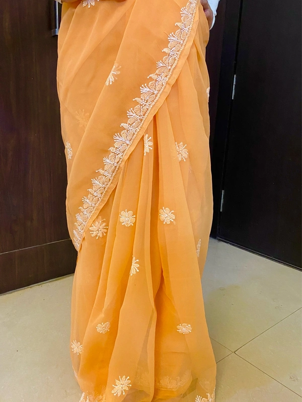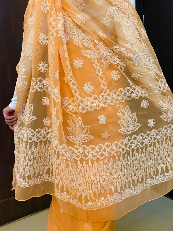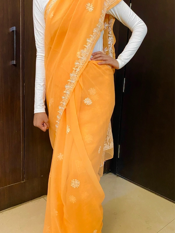 Light Orange Chikankari White Embroidered Saree