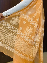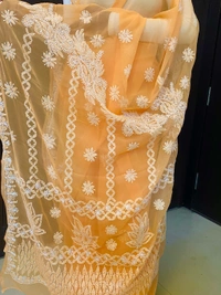 The highlight of this piece lies in its intricate hand-embroidered Chikankari work, delicately done with fine white threads. The pallu and borders are richly adorned with detailed craftsmanship, showcasing neat and refined karigari that reflects timeless artistry. The subtle contrast of white embroidery on the soft orange base adds a touch of sophistication and charm.