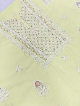 - Intricate Chikankari Embroidery: Masterfully hand-embroidered motifs enhanced with multi-colored pearls, katdana, and shimmering sequins.