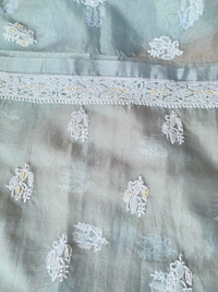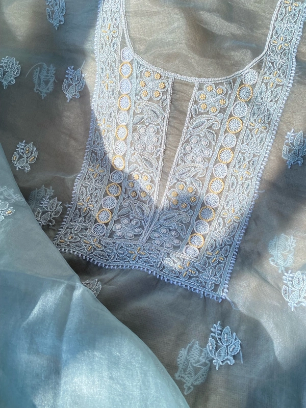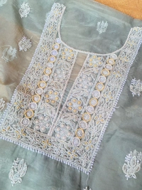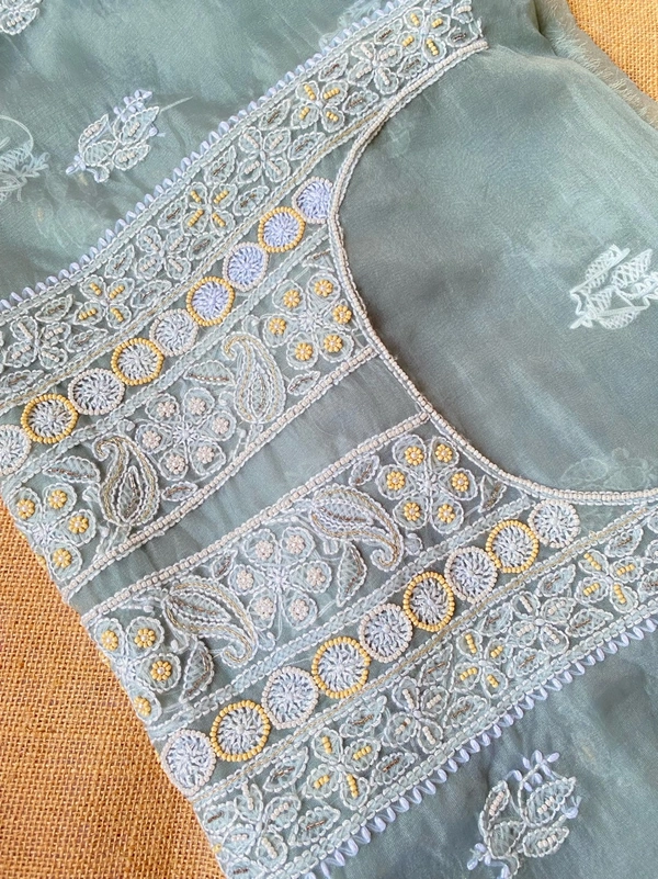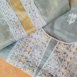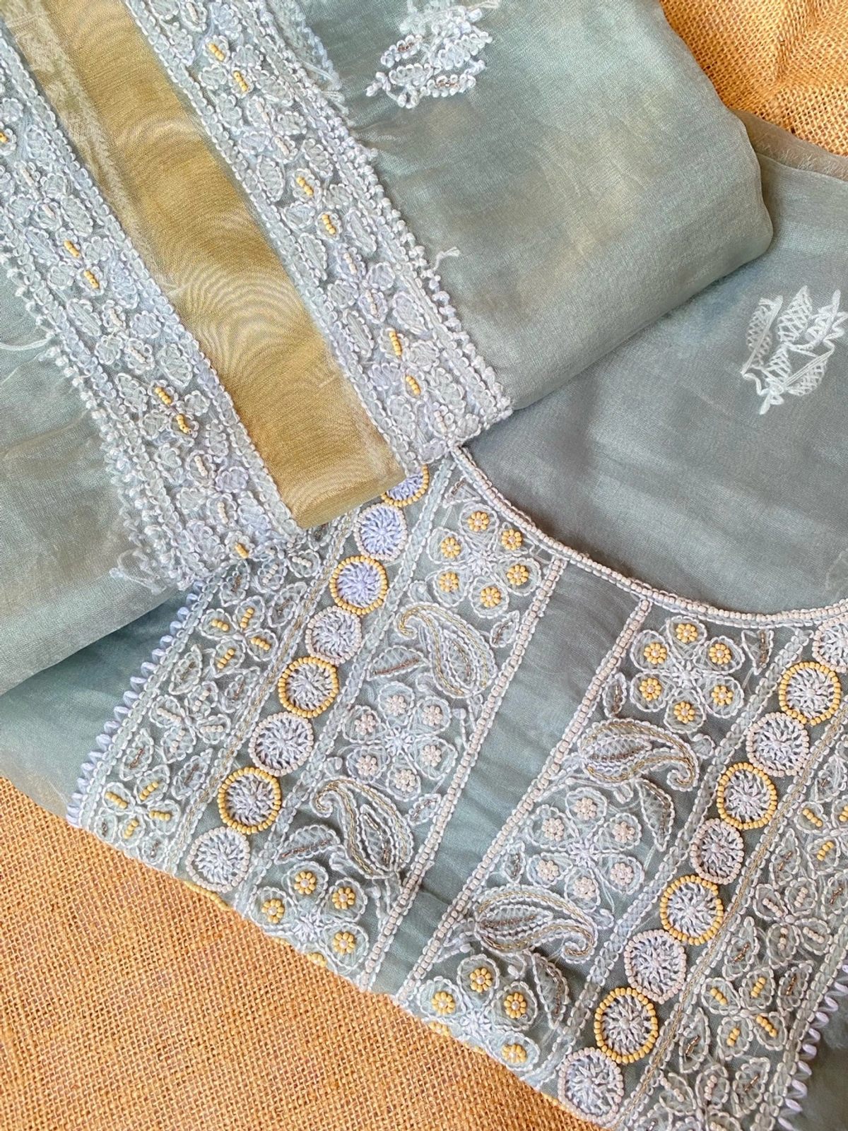 Elevate your party wear wardrobe with our exquisite Chikankari unstitched kurta dupatta set, crafted on luxurious organza fabric. This stunning ensemble is a masterpiece of traditional craftsmanship, featuring intricate Chikankari embroidery with beautiful yog and all-over motifs, adorned with pearls, sequins, and beads.