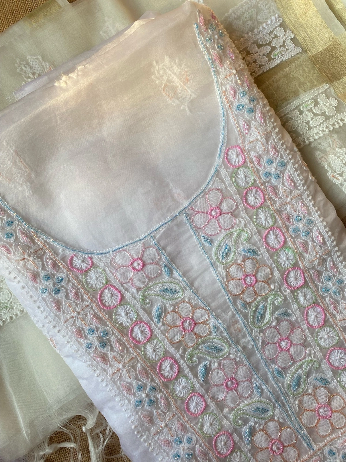 Elevate your wedding and special occasion wardrobe with our exquisite off white organza unstitched kurta dupatta set. This stunning ensemble features beautiful white Chikankari embroidery, intricately adorned with multiple color pearls, beads, and sequins work.