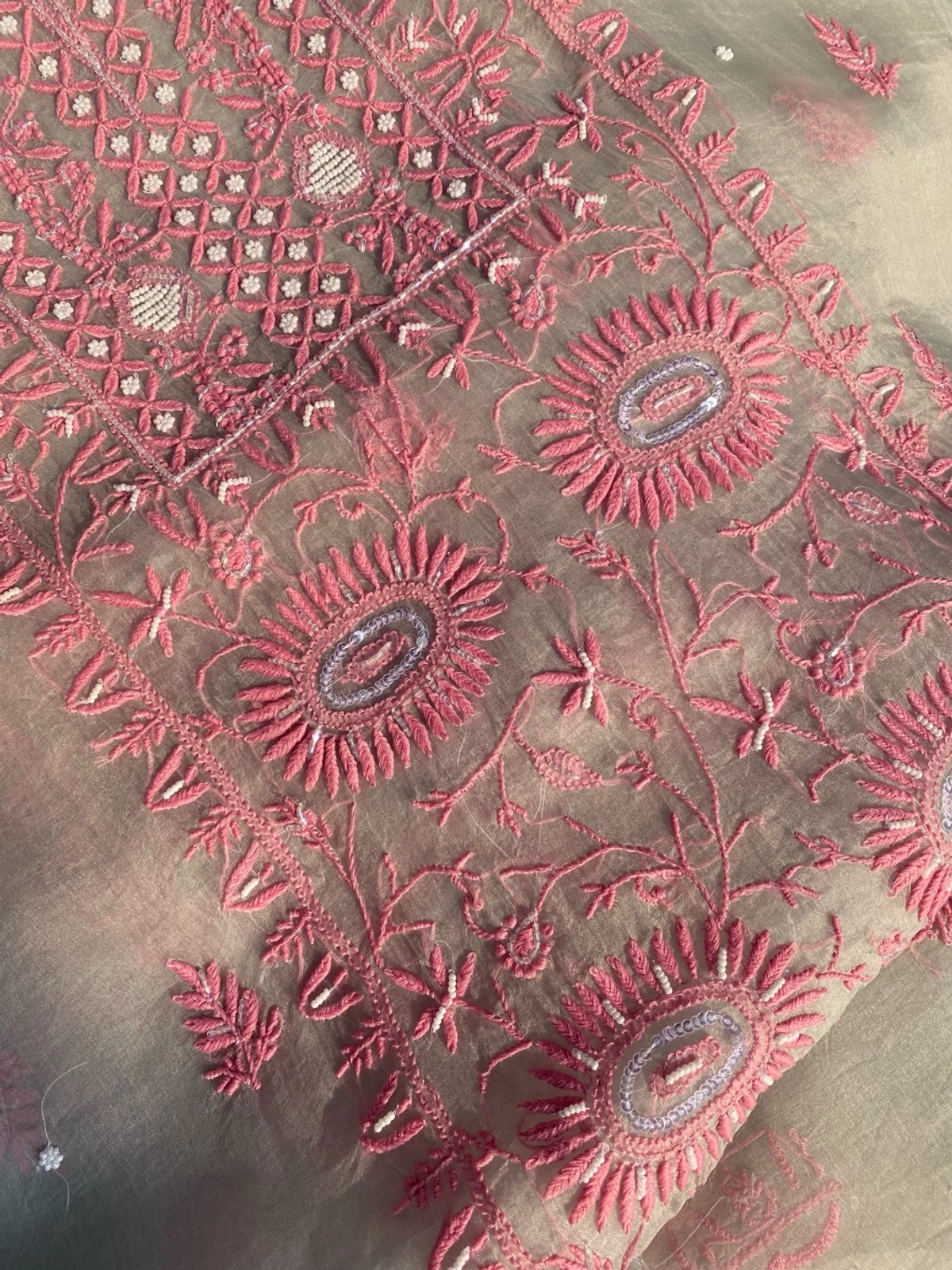 - Embroidery: Fine Chikankari work with pearls, beads, and sequins