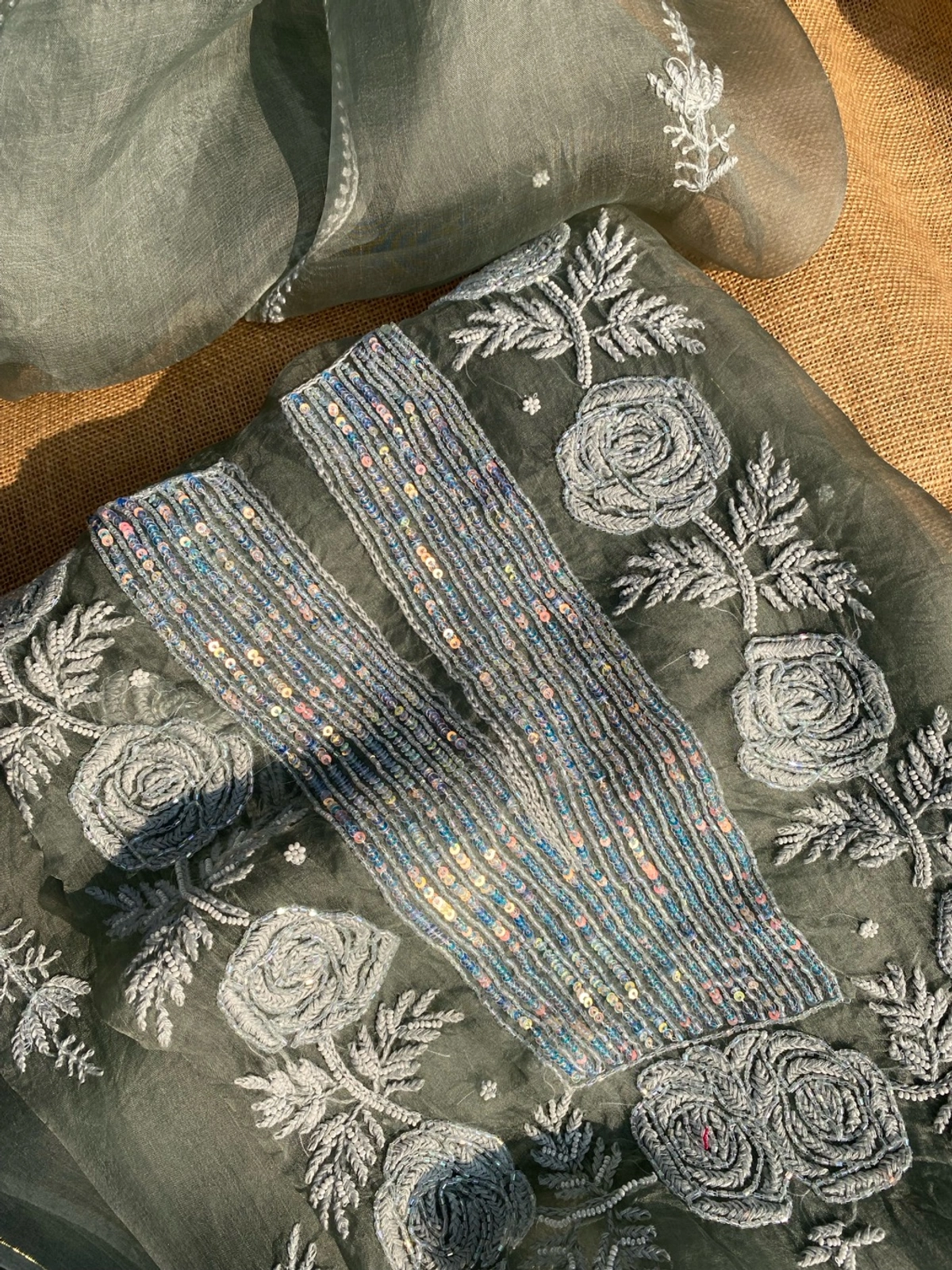 - Embroidery: Super fine Chikankari work with sequins, pearls, and beads