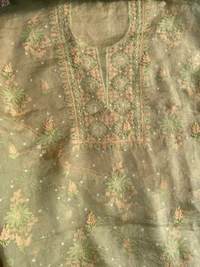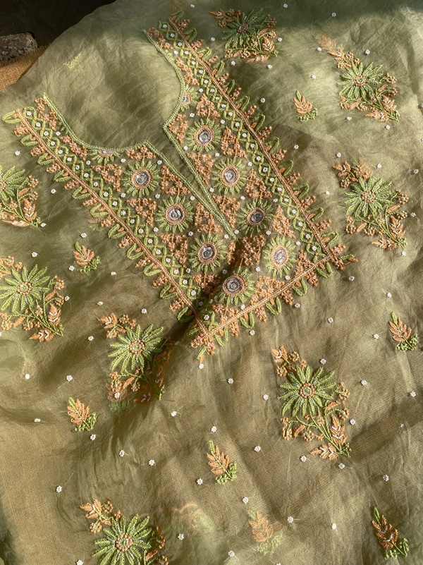 - Embroidery: Fine Chikankari work with pearls, beads, and sequins