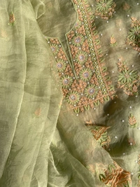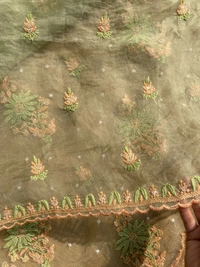 Elevate your style with our exquisite olive green Chikankari Unstitched Kurta & Dupatta Set, crafted in pure Organza fabric. This stunning ensemble features delicate pink Chikankari embroidery, beautifully enhanced with pearls, beads, and sequins work. The scallop design on the dupatta and sleeves adds a touch of sophistication, making it perfect for party wear