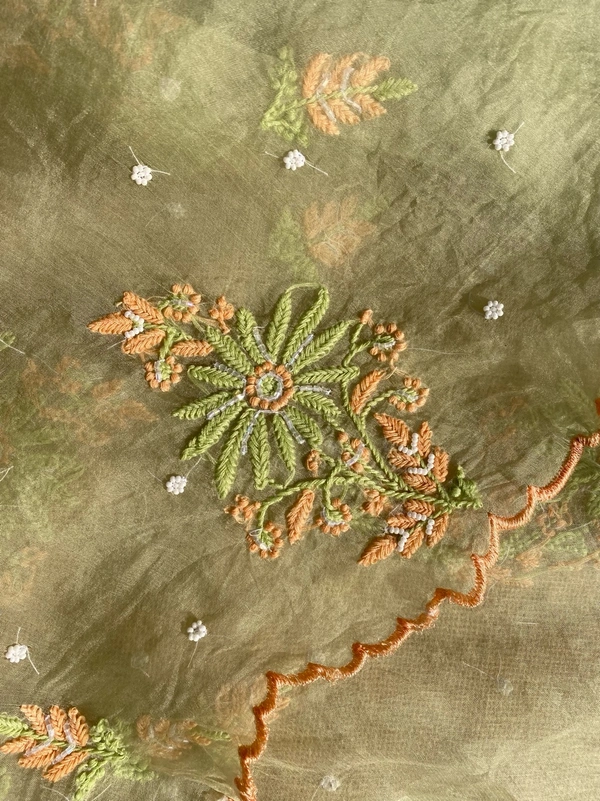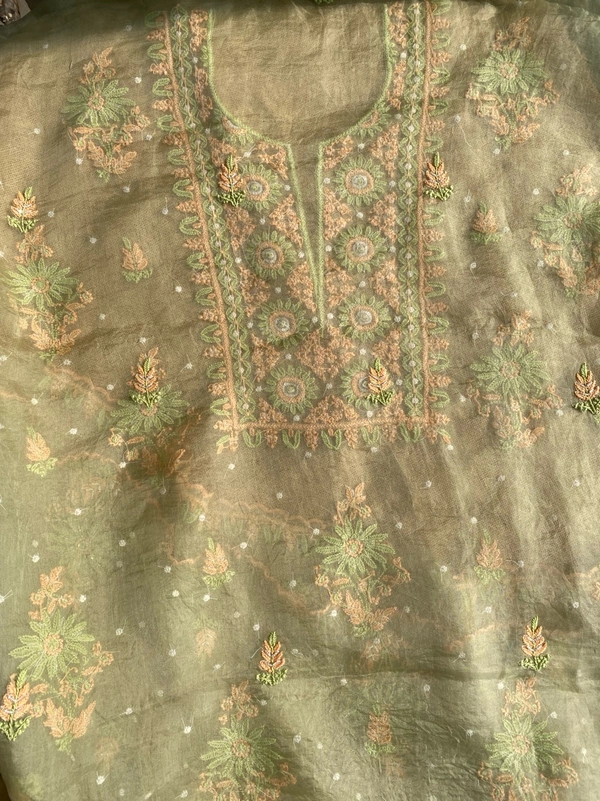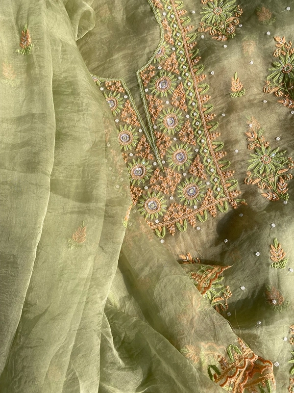 Meher Premium Organza Chikankari Unstiched Dress- Olive Green