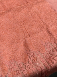 What truly sets this piece apart is the intricate net and patchwork detailing on the daman and sleeves. This unique design element adds a contemporary touch to the classic silhouette, making it stand out with grace and sophistication.