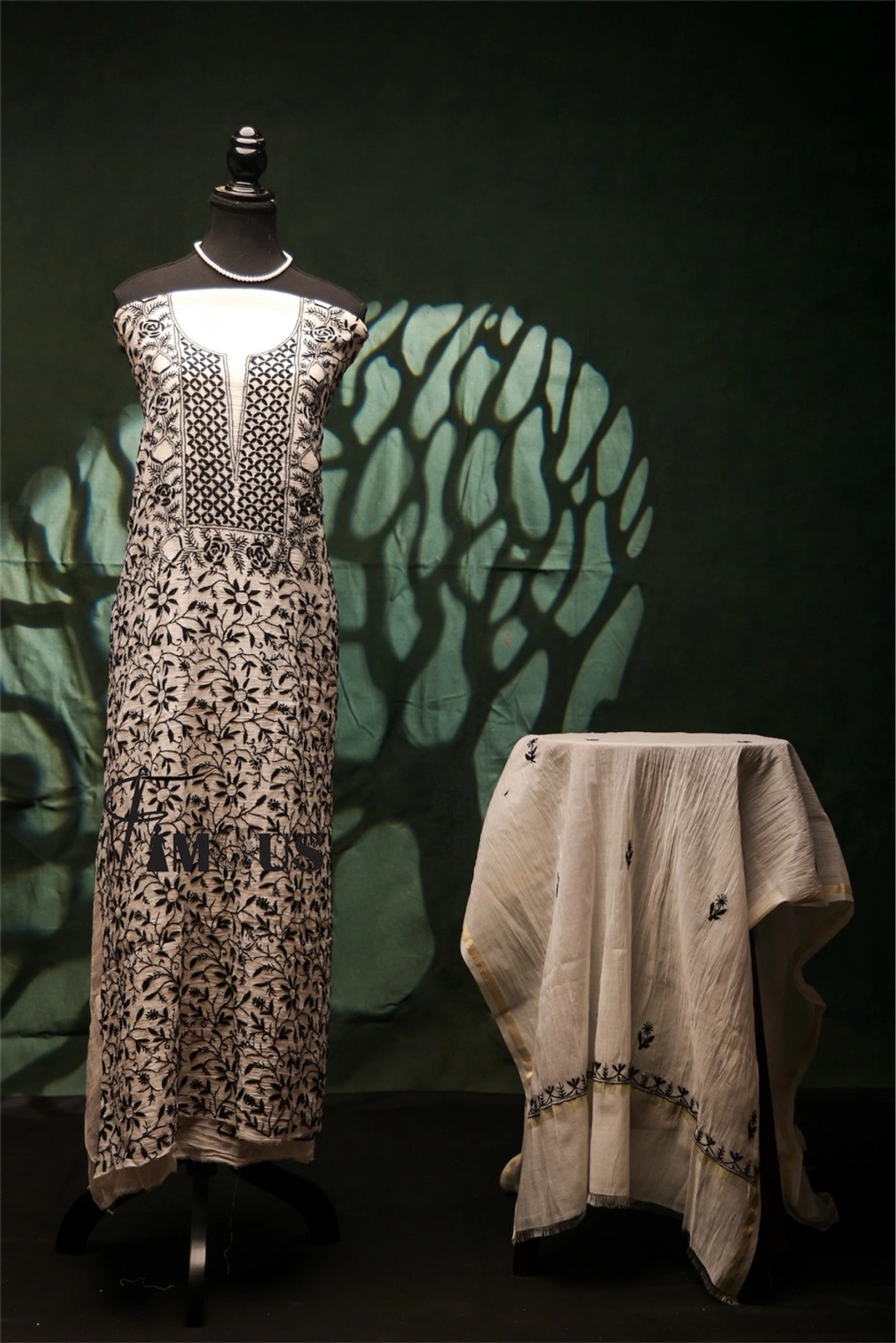 Off White Chikankari Black Jaalwork Mul Chanderi Unstiched Dress