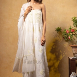 Step into sophistication and timeless beauty with our Off White Chikankari and Zardozi Semi-Stitched Gown. Crafted from luxurious Soft Mul Chanderi fabric, this exquisite gown is a harmonious blend of traditional artistry and modern design. The intricate Chikankari handwork, adorned with shimmering pearls, katdana, and sequins, showcases unparalleled craftsmanship, making this gown a true masterpiece.