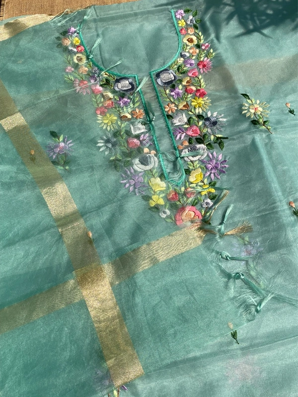 Elevate your ethnic style with this luxurious unstitched kurta and dupatta set in premium organza fabric. The kurta features exquisite multi-embroidered Parsi Gara handwork on the neckline, complemented by delicate small motifs and beautifully embroidered sleeves, offering a timeless, elegant look.