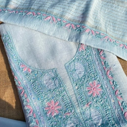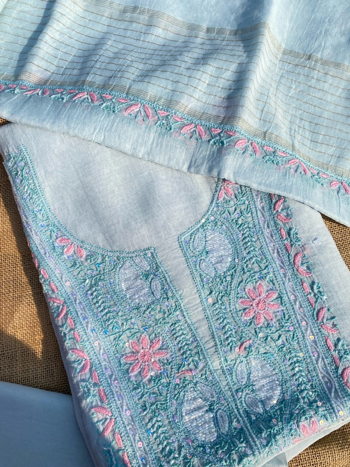 Pastel Blue Chikankari Unstitched Kurta Dupatta Set