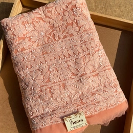 Elevate your ethnic wardrobe with this gorgeous peach chikankari dress material, crafted in luxurious faux georgette fabric. Features intricate all-over jaal work chikankari with neat handwork and white thread embroidery.